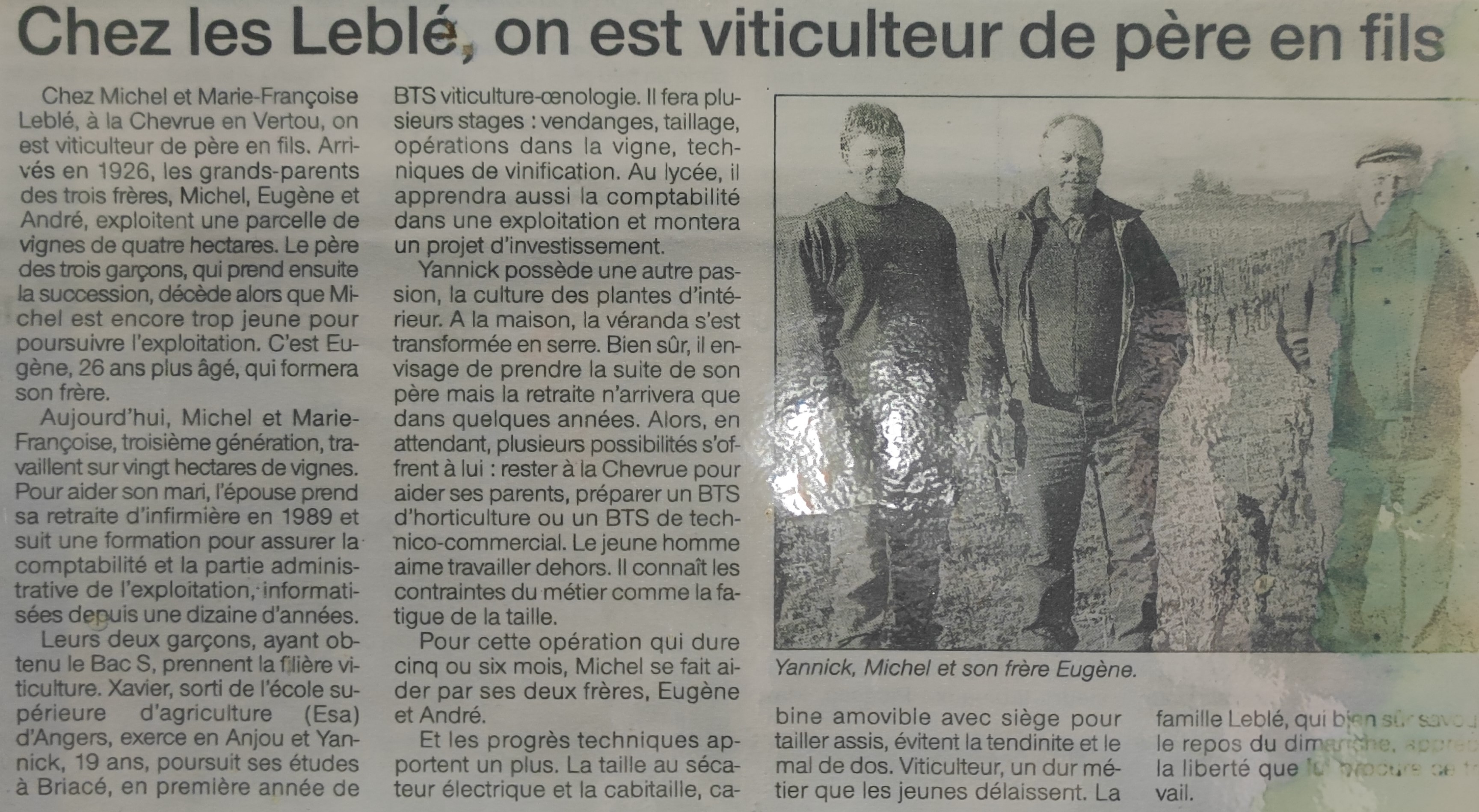 En 1985, naît Yannick Leblé fils de Michel et sa femme Marie-Françoise. Le premier pressoir pneumatique arrive en 1987 avec l’installation de Michel.
